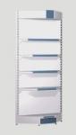 Металлические стеллажи ставятся не только вдоль стен, но и бывают островных типов с изящными округлыми и овальными формами. Полки могут менять свою высоту и устанавливаться не только горизонтально, но и в наклонном положении тоже.